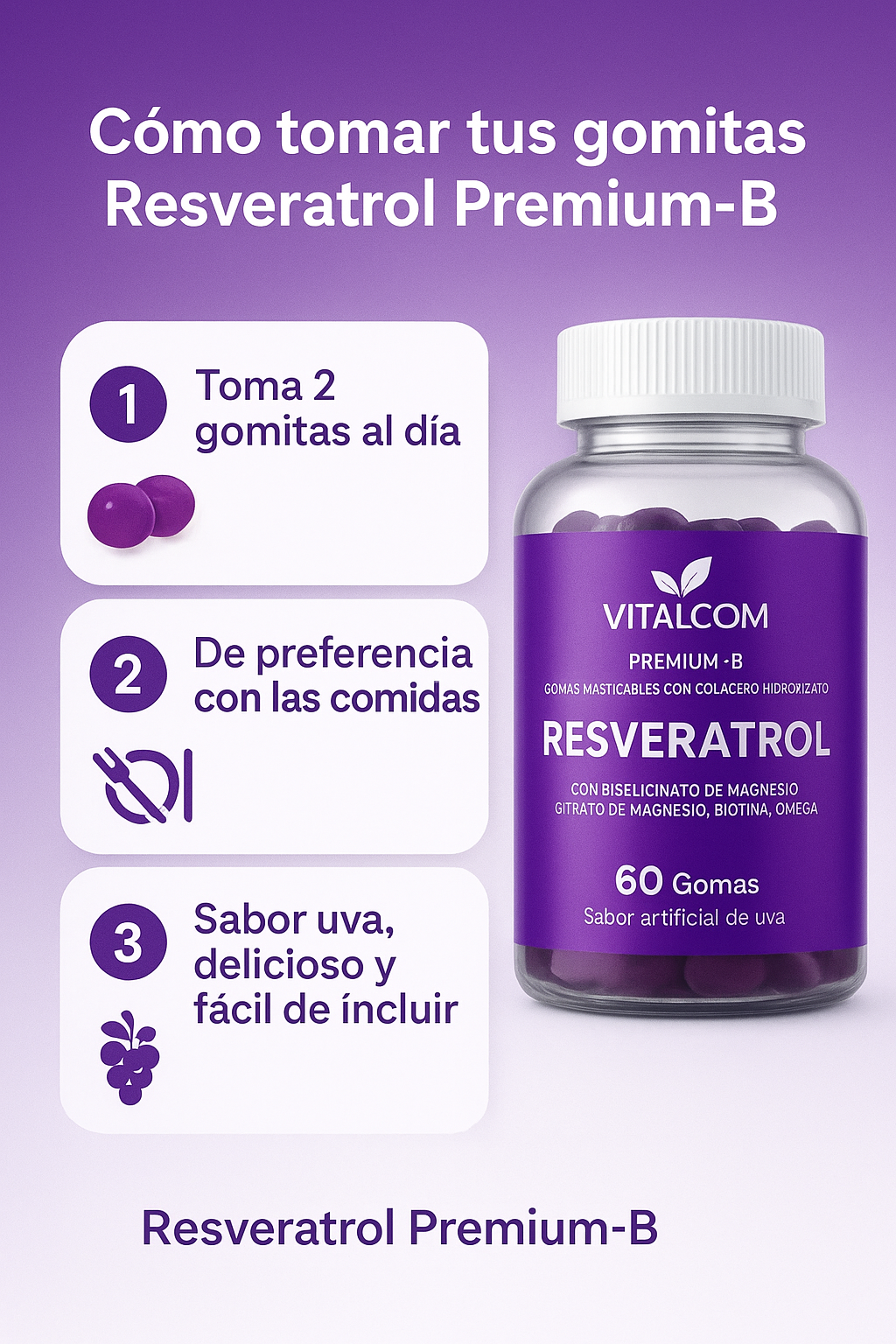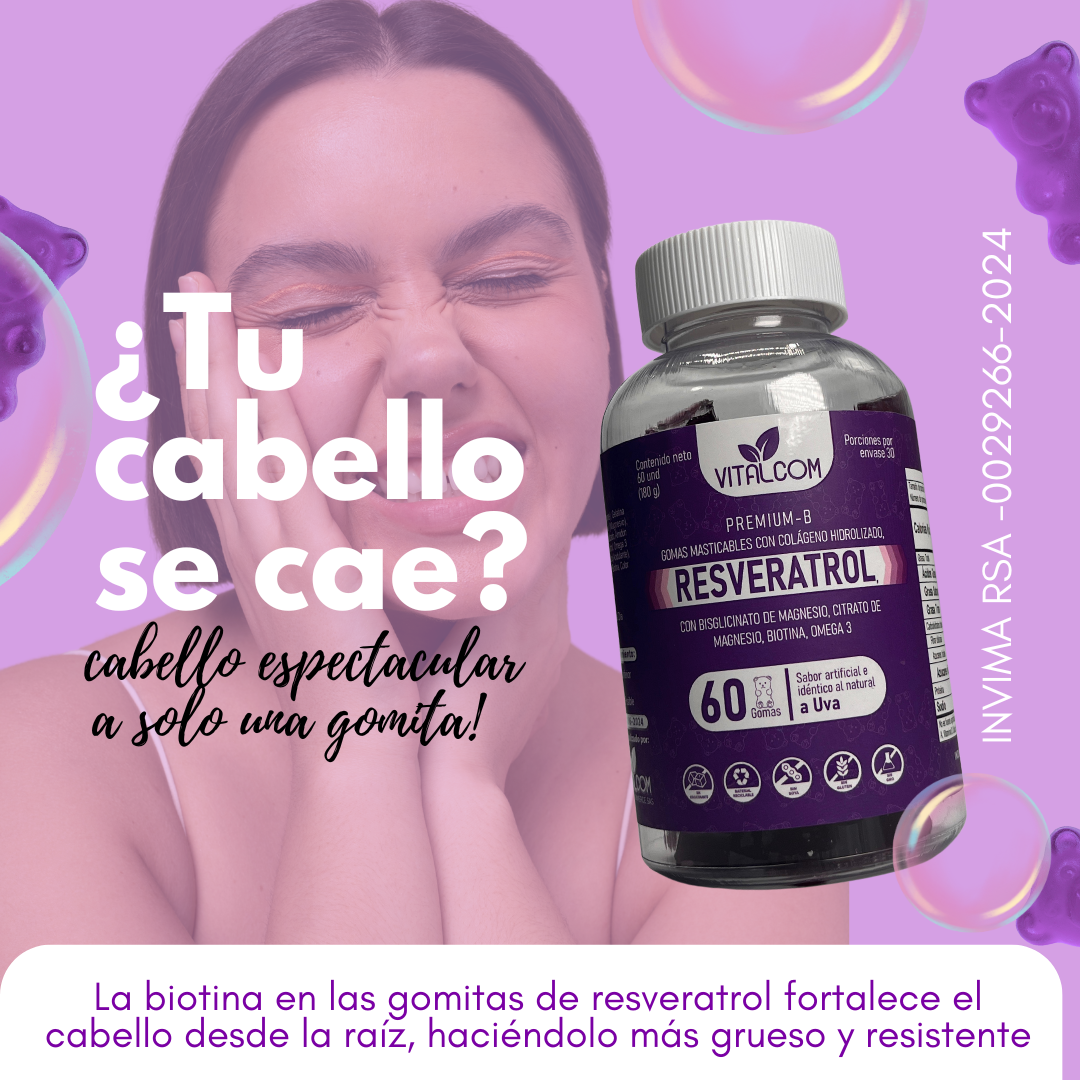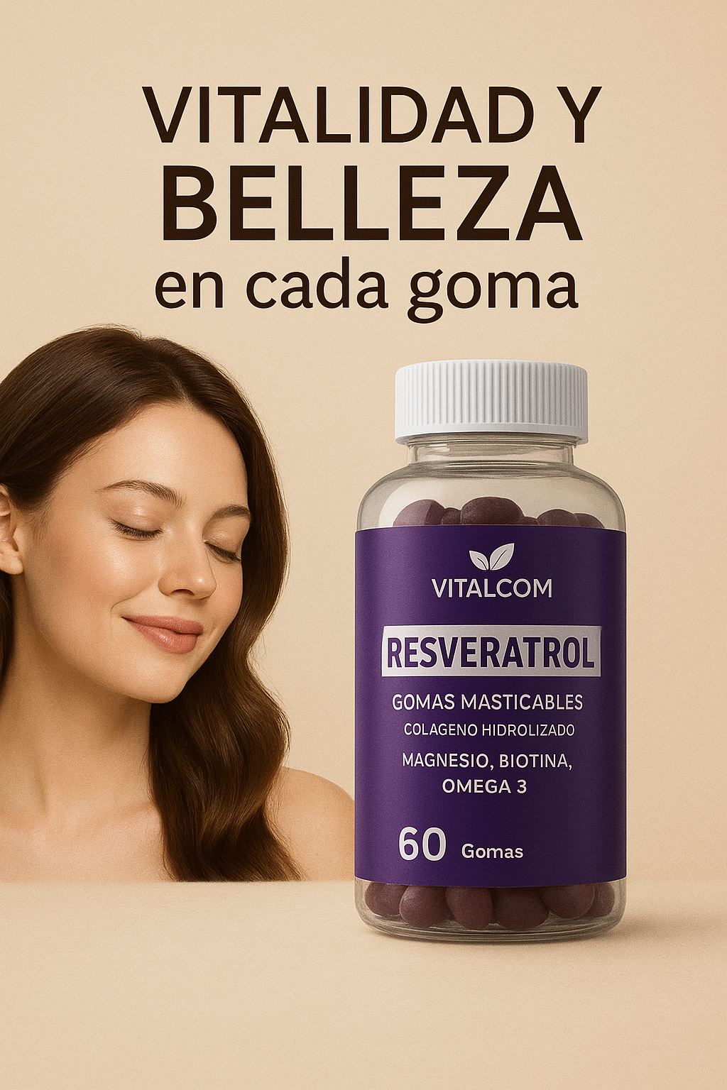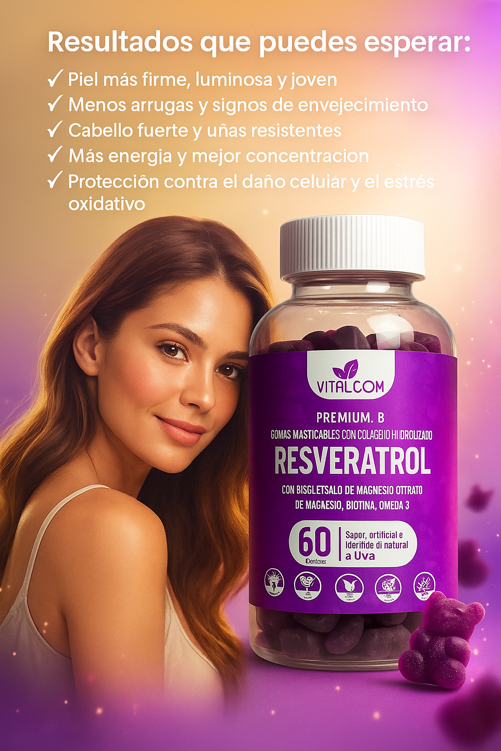 Con Resveratrol, Colágeno y Biotina, estas gomitas te ayudan a tener piel firme, cabello fuerte, más energía y protección contra el envejecimiento.