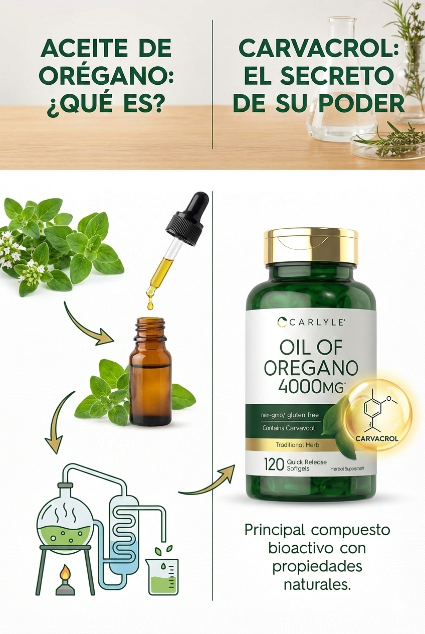El aceite de orégano es un suplemento natural extraído de la planta Origanum vulgare, rico en compuestos activos como carvacrol y timol, que le confieren sus principales actividades biológicas.